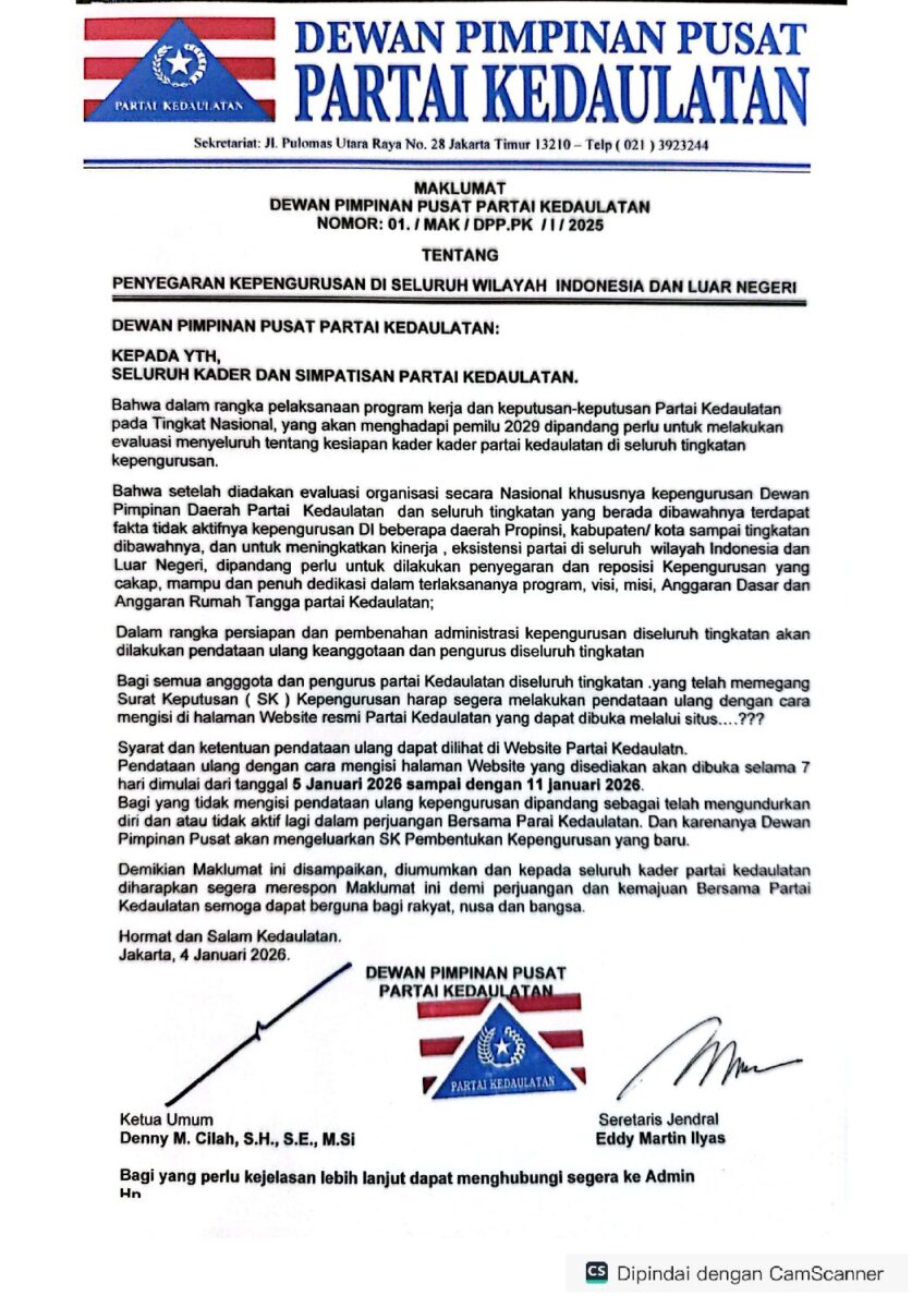 PARTAI KEDAULATAN — Dewan Pimpinan Pusat (DPP) Partai Kedaulatan menyebarkan maklumat kepada seluruh kader dan simpatisan partai dalam rangka penyegaran kepengurusan di seluruh wilayah Indonesia dan luar negeri. Bahwa dalam rangka pelaksanaan program kerja dan keputusan-keputusan Partai Kedaulatan pada tingkat nasional, yang akan menghadapi pemilu 2029 dipandang perlu untuk melakukan evaluasi menyeluruh tentang kesiapan kader kader partai kedaulatan di seluruh tingkatan kepengurusan.